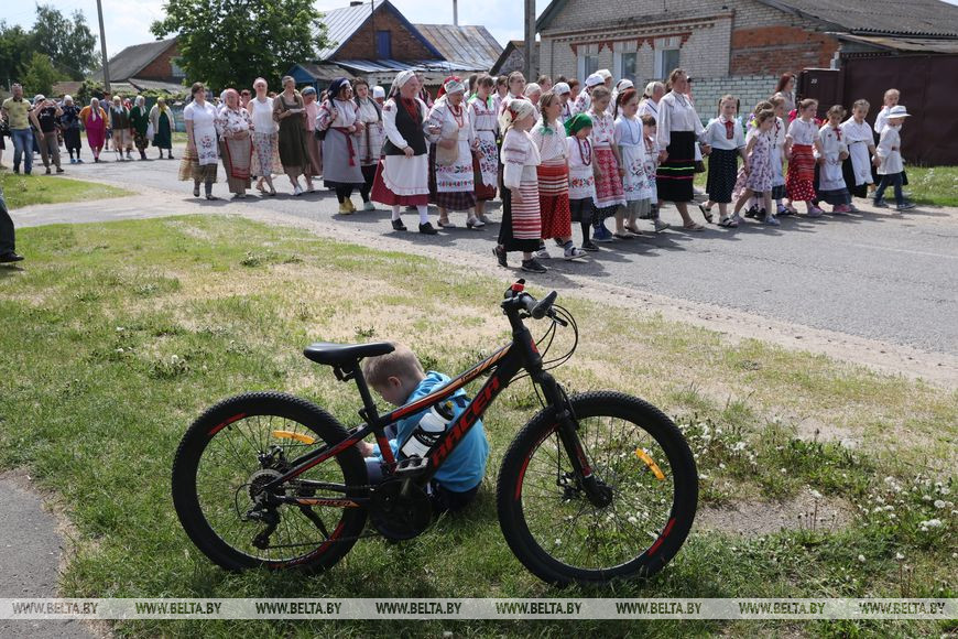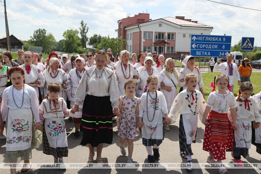 Основное действо зачинает двойной хоровод на центральной улице. Самые маленькие взялись кольцом внутри, взрослые - вокруг них. Затем с двух сторон к главному перекрестку агрогородка направляются группы. Дружно запевают:
