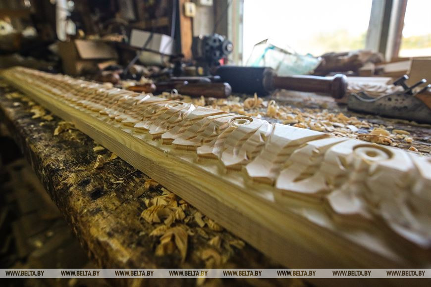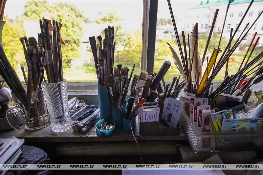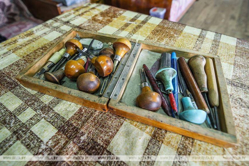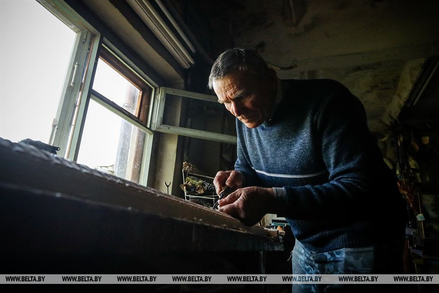 Анатолий Савельевич встречает нас в своей мастерской. В эти дни он занят изготовлением резных оконных наличников для исторического здания в Бресте. "Я родился и живу в Каменце. Лишь год с семьей прожили в Бресте, потом вернулись сюда. Мне здесь комфортно, нет суеты, очень живописно. Когда организовывал международные пленэры по живописи, ребята из Польши писали, что Каменец - рай для живописца. Здесь действительно интересно: речка, башня, холмы, исторические места. Всегда можно найти старинные уголки", - заметил мастер.