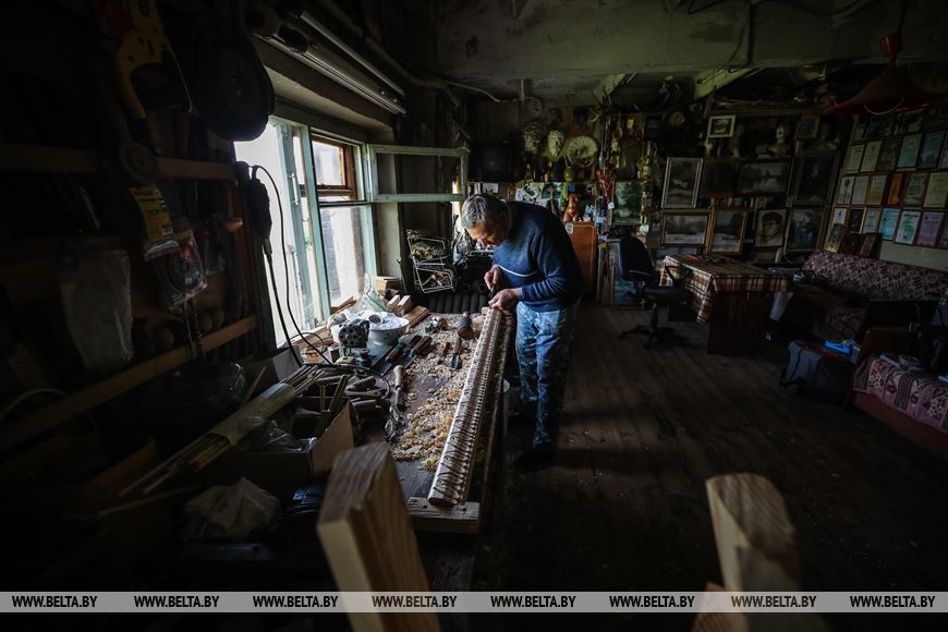 Все это время Анатолий Турков не бросал живопись, периодически занимался резьбой по дереву. В такой технике он создает и картины - мастерство традиционное для региона Беловежской пущи. Процесс очень кропотливый, требующий массы терпения. Ближе к 50 годам у него пробудился интерес к деревянной скульптуре. Все началось в начале 2000-х годов с неожиданного предложения поучаствовать в пленэре в Польше. "Я тогда взял топоры, стамески и поехал. Там было как-то не по себе. Я-то с топорами приехал, а люди - с бензопилами и электроинструментами. Чтобы высекать из дуба, здоровья хватало. Сделал работу - всем понравилось, но столько сил и энергии потратил. Ребята могли себе позволить работать, сидя в кресле и попивая кофе. Они за день делали то, что я три дня высекал топором. Сделал выводы, что нужно покупать электроинструмент", - вспомнил первый опыт создания деревянной скульптуры народный мастер.