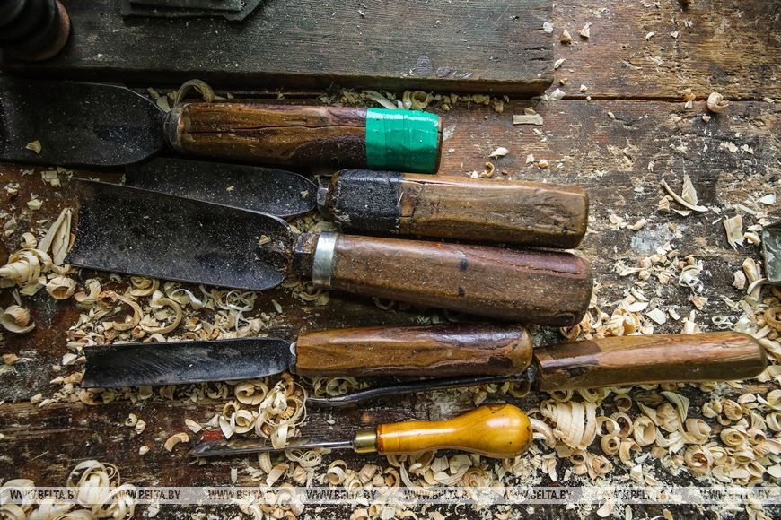 Рождается деревянная скульптура из дубовой колоды. Бензопилой мастер придает ей нужные очертания. Создавая детали, берется за стамески. Их, кстати, в походной сумке Анатолия Туркова корреспондент БЕЛТА насчитала более 30 различного размера и конфигурации. Скульптуры каменецкого мастера можно увидеть во многих населенных пунктах Беларуси. Например, на территории Брестской области его руками на пленэрах создано 20 деревянных композиций, только в одних Коробчицах Гродненской области - 12.