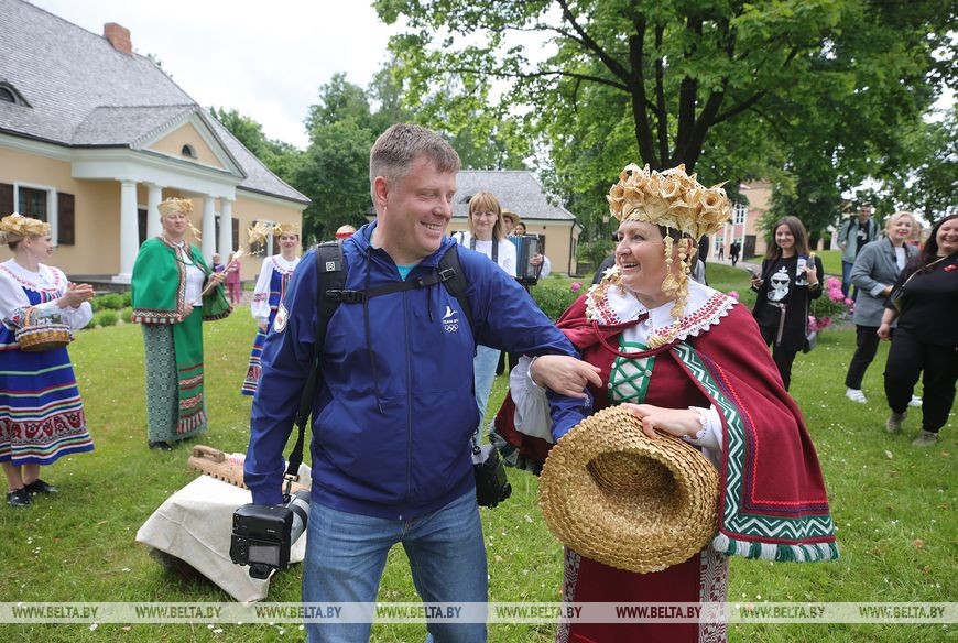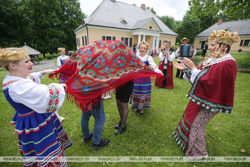 Музей - это не только дом, но целый комплекс: флигель, клеть, колодец, беседка. Во дворе усадьбы гостей ждали местные забавы с колоритом по-новогрудски. Выбрать хозяина и хозяйку, помиловаться, станцевать лявониху. "Наша задача объединить всех. Мы кроме развлекательной такой музыкальной программы, покажем, как раньше утюжили рушники с помощью своеобразной местной качалки", - говорит режиссер народного коллектива Инна Гайба.
