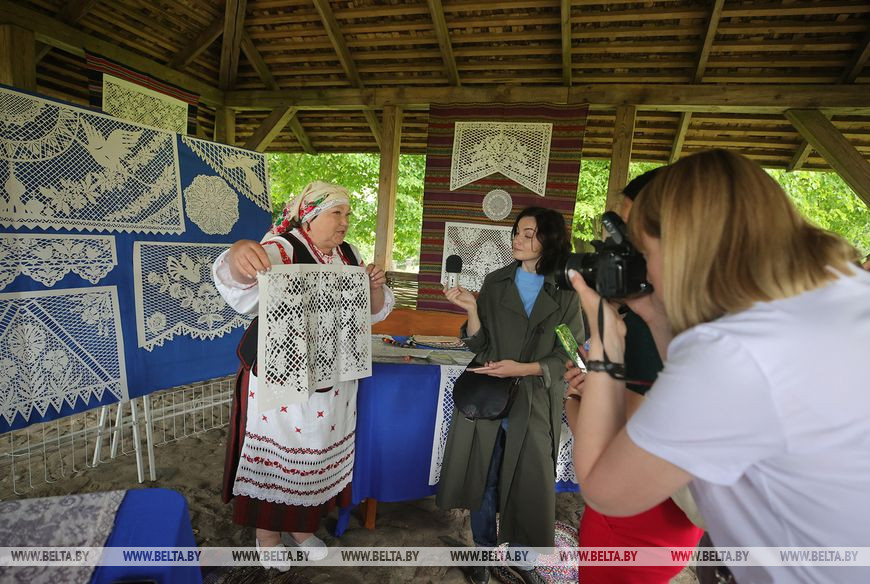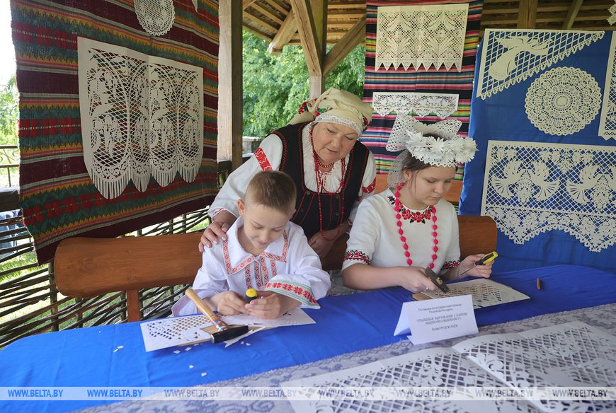 А неподалеку в беседке гостей научили местному традиционному искусству вытинанки-выбиванки, которое занесено в список нематериальных культурных ценностей Беларуси. Наталья Климко искусство выбивания ажурных занавесок на бумаге переняла от рукодельницы Нины Шурак. "В отличие от других вытинанок Новогрудскую не вырезают ножницами, а выбивают из сложенной в несколько раз бумаги. Делают это с помощью долота и расплющенного гвоздя", - рассказывает сама Наталья Климко.