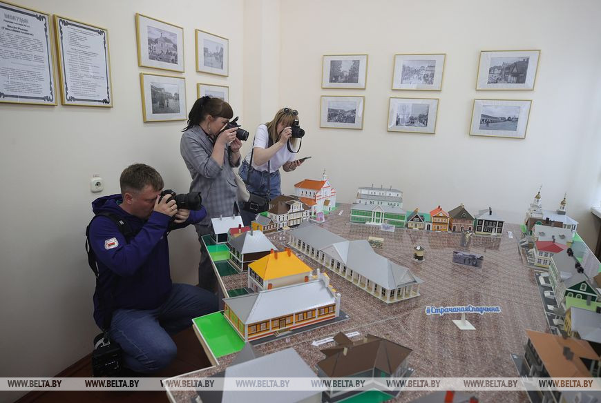 По старинным улочкам компания журналистов добирается до местного мини-музея макетов "Страчаная спадчына". Один из них - макет рыночной площади Новогрудка начала 20 века, в котором можно рассмотреть не сохранившиеся до наших дней здания и строения. Гостям, как всем туристам, которые заглядывают в музей, предлагают сделать фото в ретро-ателье. За несколько минут можно перевоплотиться в горожанина и горожанку прошлого столетия.