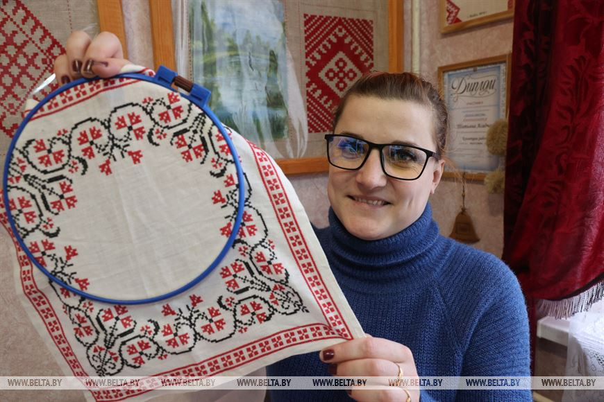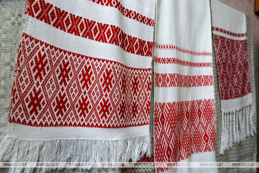 Не менее интересны для изучения такие виды ремесел, как вышивка и ткачество. Эти виды прикладного искусства исторически тесно связаны между собой. "Домотканые полотна запасливые и трудолюбивые девушки складывали в сундуки для "пасага" - на приданое. Как правило, ткали изо льна, конопли. Полотна получались сероватого оттенка. Перед пошивом от большого рулона отрезался нужный кусок, отбеливался, и хозяйка достаточно быстро шила рубахи, юбки, передники", - рассказала руководитель народного клуба мастеров народных художественных ремесел "Спадчына" Ольга Загвоздова во время экскурсии по выставочному залу Дома ремесел.