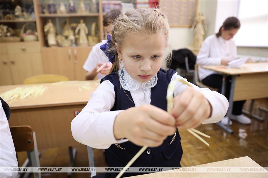 Второклассница Никандра Юневич самая младшая из присутствующих в классе. Возраст, однако, на старании никак не сказывается. Девочка, высунув кончик языка от усердия, тщательно перебирает соломинки. В студии Валентины Васильевны школьница занимается второй год. Многих учащихся на занятия по соломоплетению записали родители, а вот Никандра проявила самостоятельность. Вспомнив, как здорово было заниматься лепкой и аппликациями в детском саду, первоклашка постучалась в дверь студии. "Мне захотелось плести, я подумала, вдруг получится, и поэтому пришла", - рассказывает, не отрываясь от работы, усидчивая второклассница.