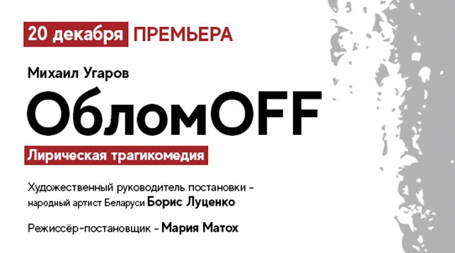 10 декабря, Минск /Корр. БЕЛТА/. Премьера лирической трагикомедии "ОбломOFF" по пьесе Михаила Угарова состоится в Национальном академическом драматическом театре имени М. Горького 20 декабря, сообщили корреспонденту БЕЛТА в театре.