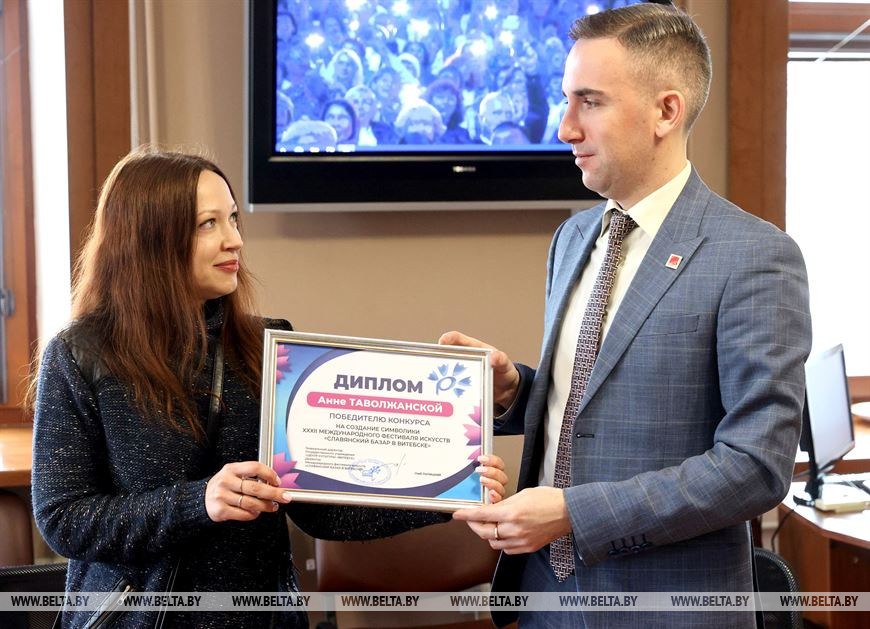 12 января, Витебск /Алеся Пушнякова - БЕЛТА/. Логотип XXXII Международного фестиваля искусств "Славянский базар в Витебске" будет представлен в феврале-марте. Об этом на церемонии награждения победителя конкурса на дизайн нового логотипа сообщил генеральный директор Центра культуры "Витебск", директор фестиваля искусств Глеб Лапицкий, передает корреспондент БЕЛТА.
