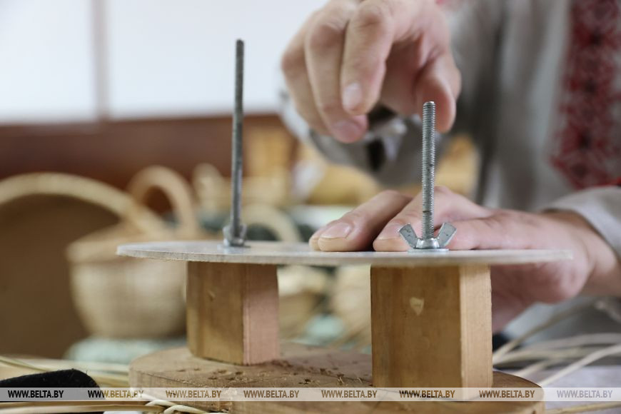 Для журналистов БЕЛТА Павел провел небольшой мастер-класс - показал, как букет лозовых веток превращается в сухарницу. Прутья крепятся к шаблону, затем оплетаются. Для гибкости их смачивают водой. "В идеале нужно успеть завершить изделие за день. Иначе приходится идти на уловки, чтобы лоза, высыхая, как можно меньше ломалась в процессе плетения. Например, когда делал большую корзину для "Дажынак", поливал ее из дождика в ванной, накрывал влажной простыней, а сверху еще и пленкой", - пояснил мастер.