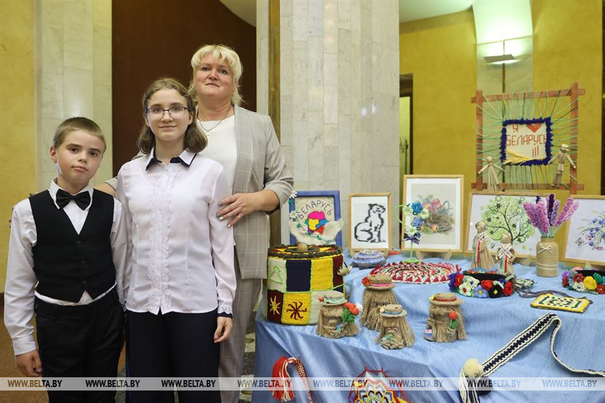 Также в дополнение к концерту прошла выставка художественных работ. Из Наровли свои работы привезли два воспитанника районного центра творчества и молодежи. Шестиклассница Арина Ильина подготовила панно "Я люблю Беларусь". Она сама выткала его на станке и украсила васильками.