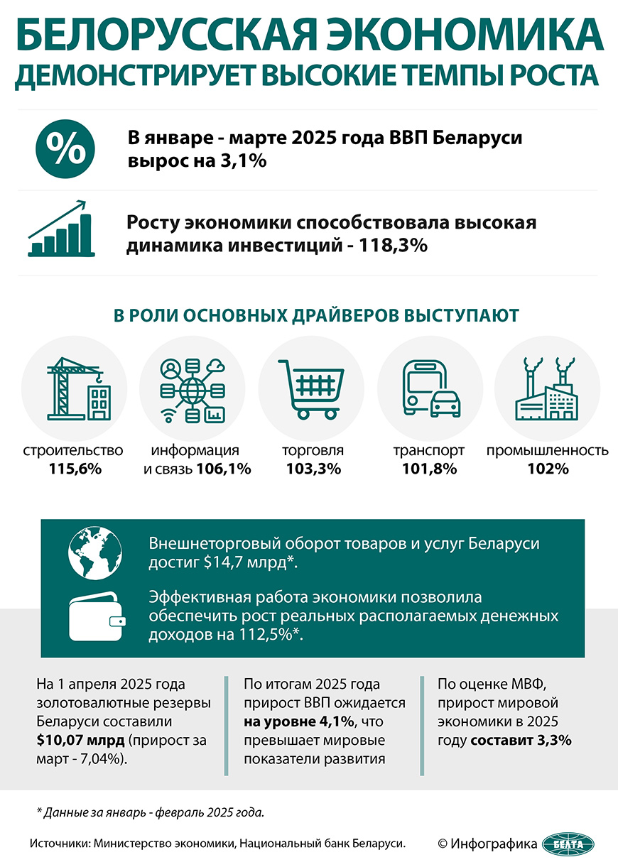 "ВВП увеличился на 3,1% в январе - марте 2025 года. Рост поддерживается секторами, ориентированными на внутреннее потребление: розничный товарооборот вырос на 10,8%, товарооборот общественного питания - на 5,5%. В промышленности рост на 2,1%", - отметили в ЕАБР.