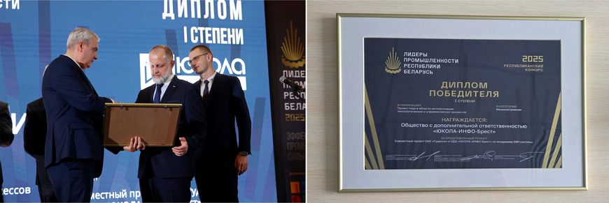 "ЮКОЛА-ИНФО-Брест" признана победителем Республиканского конкурса "Лидеры промышленности - 2025" в номинации "Проект года в области автоматизации технологических и управленческих процессов" в категории "Машиностроение".