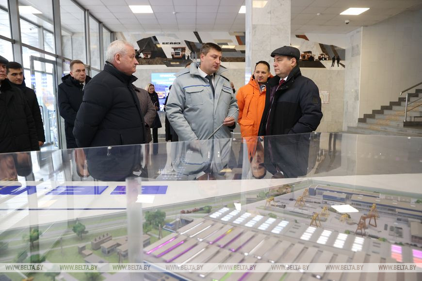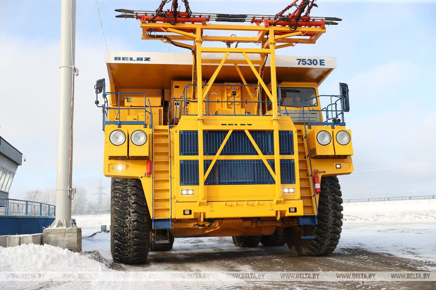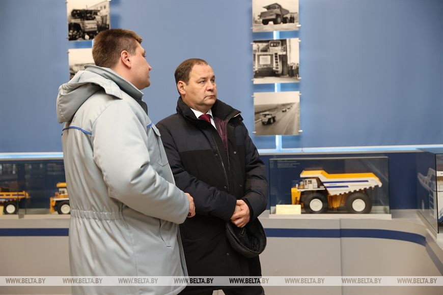 На БЕЛАЗе Роман Головченко ознакомился с производством и модельным рядом выпускаемой техники. На испытательном полигоне руководителю правительства были продемонстрированы в работе перспективные инновационные новинки предприятия: электросамосвал "БЕЛАЗ-7558E" грузоподъемностью 90 т на тяговых аккумуляторных батареях, дизель-троллейвоз "БЕЛАЗ-7530Е" грузоподъемностью 220 т, а также новая модификация карьерного самосвала "БЕЛАЗ-75711" грузоподъемностью 450 т.