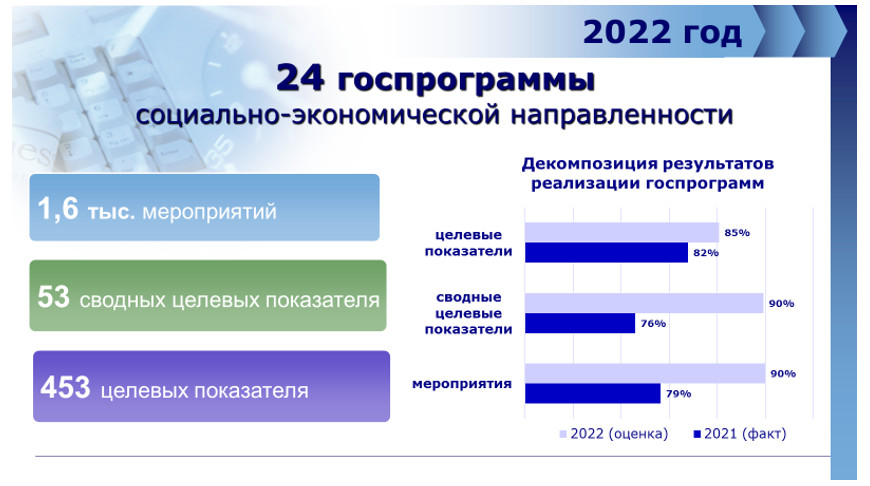 В текущем году, как и годом ранее, реализуются 24 государственные программы социально-экономического блока (перечень утвержден постановлением Совета Министров от 24 декабря 2020 года №759). Ими предусмотрено более 1,6 тыс. мероприятий. По оценке заказчиков, ожидается выполнение не менее 90% из них (около 1,5 тыс.). По ряду объективных причин (например, потеря актуальности) прогнозируется невыполнение 164 мероприятий.
