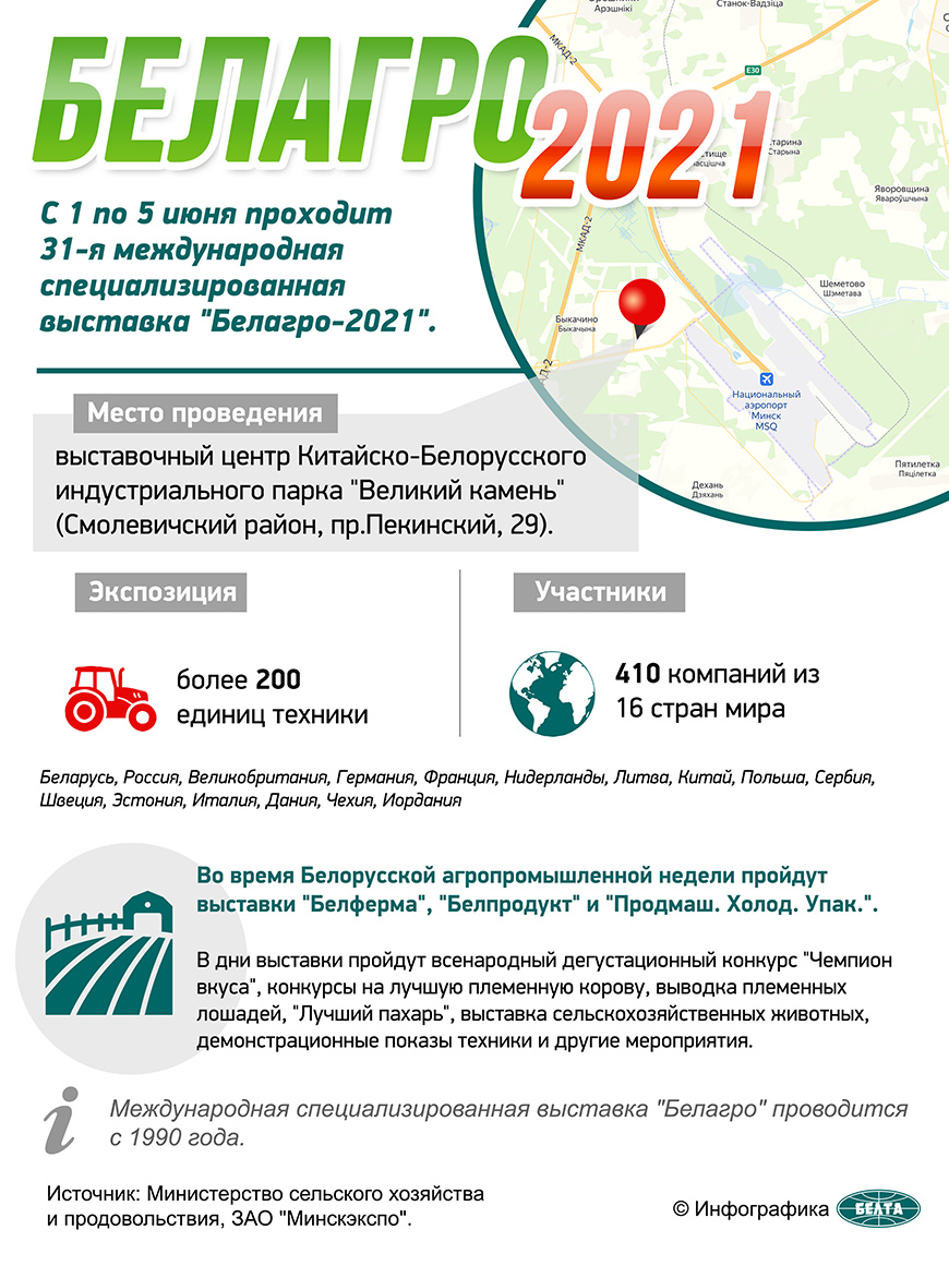 1 июня, Минск /Корр. БЕЛТА/. Минский тракторный завод представит более 20 единиц техники на международной специализированной выставке "Белагро-2021", которая пройдет с 1 по 5 июня в Китайско-белорусском индустриальном парке "Великий камень", сообщили БЕЛТА в пресс-службе предприятия.