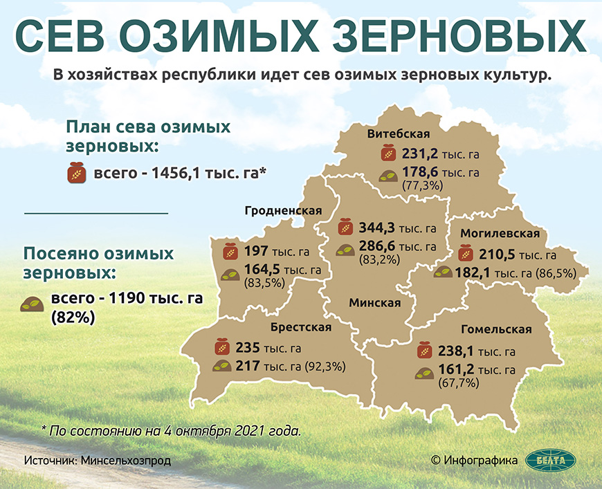 По данным на утро 4 октября, посеяно 1,19 млн га озимых зерновых при плане в 1,456 млн га. В Минской области посеяно 286,6 тыс. га (83%), в Брестской - 217 тыс. га (92%), в Витебской - 178,6 тыс. га (77%), в Гродненской - 164,5 тыс. га (83,5%), в Гомельской - 161,2 тыс. га (68%), в Могилевской - 182,1 тыс. га (86,5%).