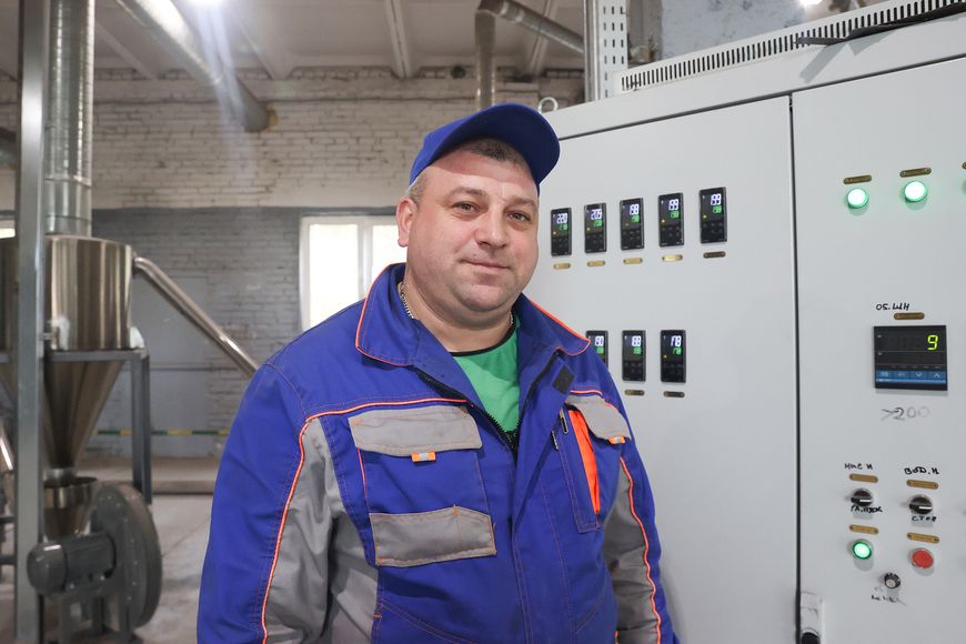 На минутку отвлекаем от работы и старшего оператора Александра Прокопчука, он родом из Крупок. Считает, что вытянул счастливый билет, устроившись в ООО "Бергия Групп". До прихода сюда долгое время жил на колесах. Попробовал разные профессии: строил мосты в Минске, пять лет каждый день ездил в Борисов на шпалопропиточный завод. Говорит, платили хорошо, но работа тяжелая, да и ночи бессонные - несколько часов занимала дорога туда и обратно. Когда новое предприятие организовывалось в военном городке, без сожаления оставил работу грузчика в магазине.