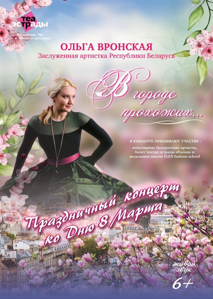 В сам праздник, 8 Марта, состоится праздничный сольный концерт "В городе прохожих..." заслуженной артистки Беларуси Ольги Вронской.
