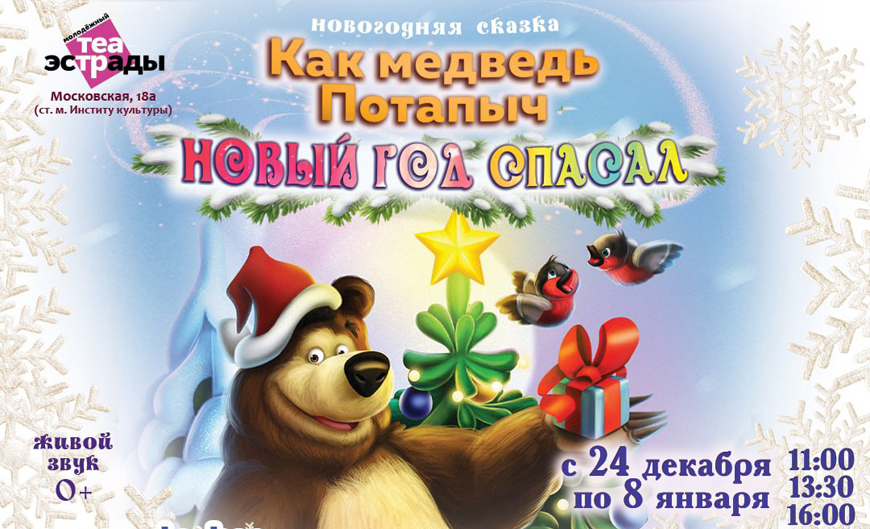Новогодняя сказка "Как медведь Потапыч Новый год спасал" будет показана на сцене театра с 24 декабря. Сюжет сказки строится вокруг спасения праздника главным героем Михаилом Потапычем и его дружной свитой.