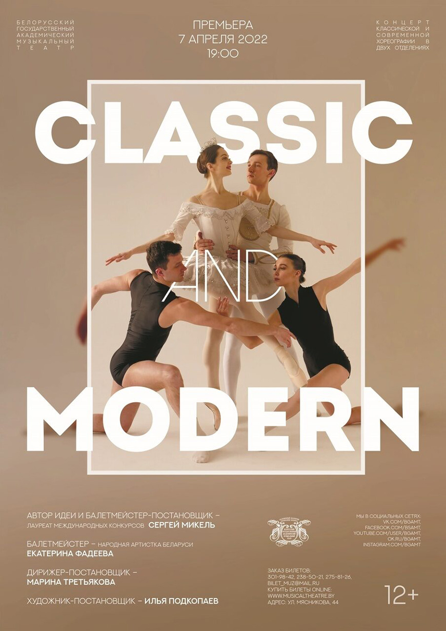 3 апреля, Минск /Корр. БЕЛТА/. Премьерный показ концерта классической и современной хореографии Classic and modern состоится 7 апреля в Белорусском государственном академическом музыкальном театре. Об этом БЕЛТА сообщили в учреждении культуры.