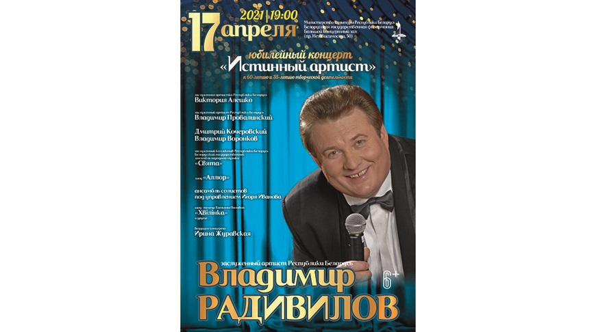 14 апреля, Минск /Корр. БЕЛТА/. Творческий вечер "Истинный артист" к 60-летию заслуженного артиста Беларуси Владимира Радивилова и 35-летию его творческой деятельности состоится 17 апреля в Большом зале Белорусской государственной филармонии. Об этом БЕЛТА сообщили в учреждении культуры.