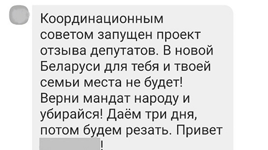 По данным следствия, днем 28 августа депутату Палаты представителей Национального собрания Беларуси с незнакомого ранее номера в установленное на его мобильный телефон приложение поступила угроза насилия, опасного для жизни и здоровья. Сообщение было следующего содержания: "Координационным советом запущен новый проект отзыва депутатов. В новой Беларуси для тебя и твоей семьи места не будет! Верни мандат народу и убирайся! Даем три дня, потом будем резать. Привет (имя сына)!".