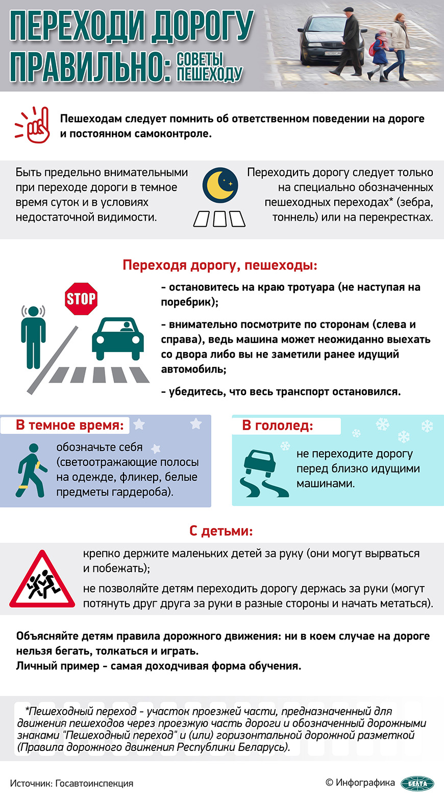 Нерегулируемые пешеходные переходы являются наиболее опасными для ребенка. Зачастую дети перебегают через дорогу, не поворачивая голову вправо и влево, разговаривают по мобильному телефону, слушают музыку через наушники. Но и водителям необходимо быть максимально внимательными, особенно проезжая вблизи школ и других детских учебных заведений. В ноябре на территории Минской области произошло три ДТП на нерегулируемых переходах с участием несовершеннолетних. Два из них зарегистрированы в темное время суток, и оба пострадавших не были обозначены световозвращающими элементами.