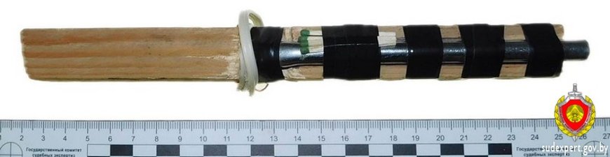 Сотрудники милиции во время пресечения незаконного оборота оружия в доме шестидесятилетнего жителя Витебска нашли предмет, похожий на самострел. По результатам баллистической экспертизы установлено, что, несмотря на свой неказистый внешний вид (к палке изолентой прикреплена металлическая трубка и спички), устройство является стрелковым гладкоствольным огнестрельным оружием раздельного заряжания. По словам специалистов, такие экземпляры самодельного оружия довольно редко поступают на экспертизу.