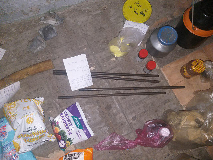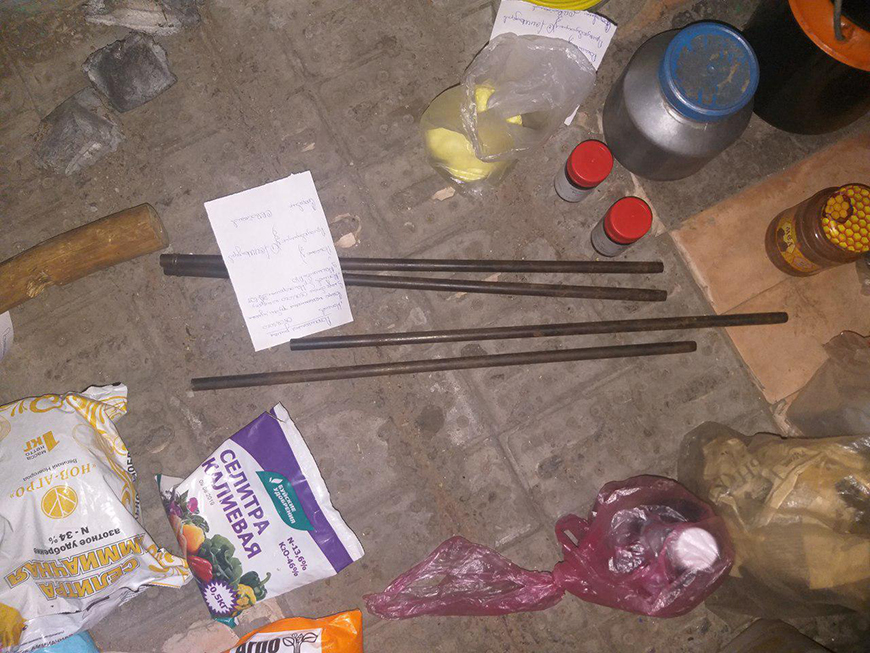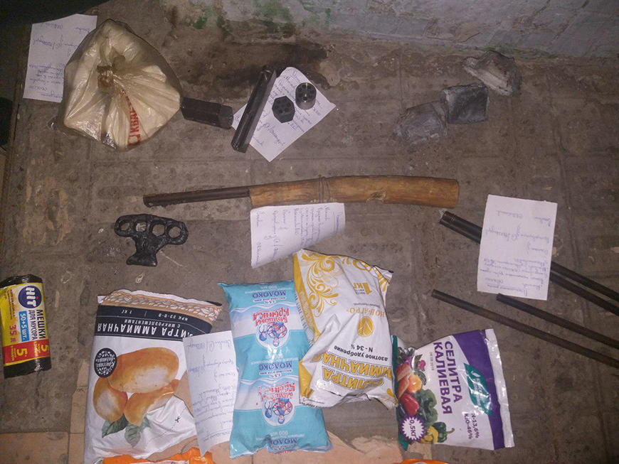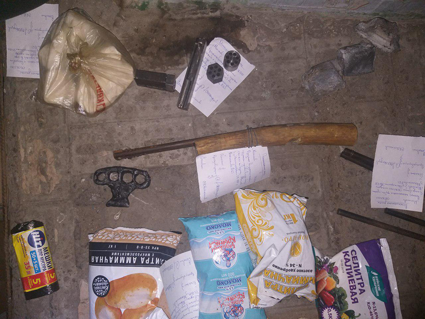 В ходе обыска по месту жительства обнаружено и изъято самодельное двуствольное огнестрельное оружие (которое согласно заключению судебно-баллистической экспертизы пригодно для производства выстрелов), кастет, заготовки для изготовления огнестрельного оружия - химические вещества, растворы, реагенты, а также емкости с дробью.