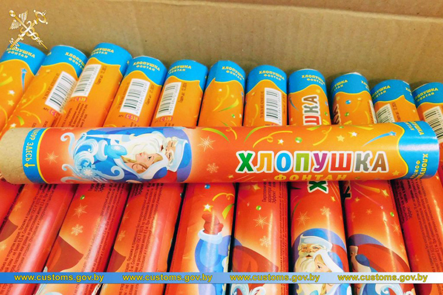 Через пункт пропуска "Мокраны" в адрес фирмы-получателя, расположенной на территории Минского района, направлялись две фуры с товарами народного потребления. При их идентификации таможенники установили, что вместо указанных в документах бумажных конфетти в грузовых отсеках полуприцепов находится свыше 690 тыс. незадекларированных новогодних хлопушек различных наименований. Кроме того, в одном из транспортных средств количество фактически имевшихся новогодних игрушек на 2 тыс. единиц превышало заявленные сведения.