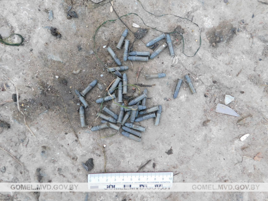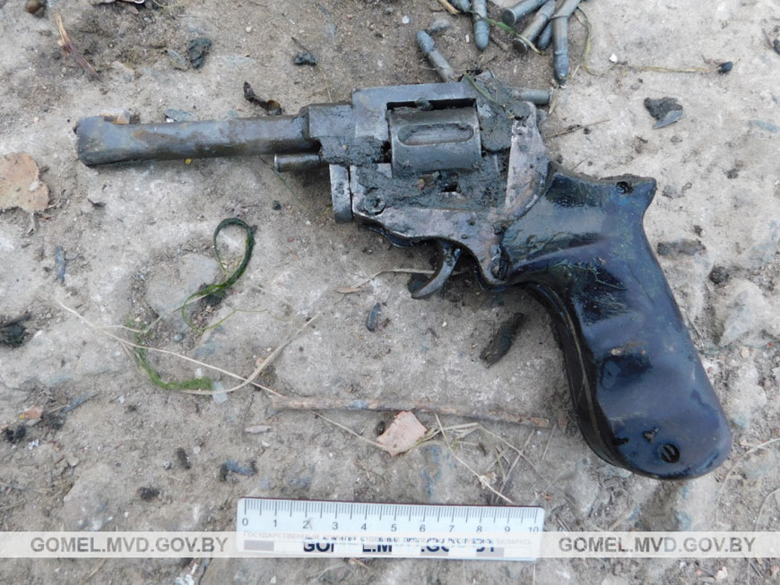 Следственно-оперативная группа Гомельского РОВД обнаружила в пакете 36 мелкокалиберных патронов и предмет, внешне напоминающий револьвер. В барабане оружия было шесть аналогичных патронов. Оружие было с механическими повреждениями. Маркировки на нем и патронах нет.