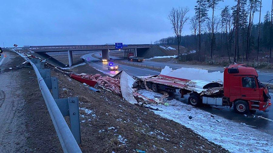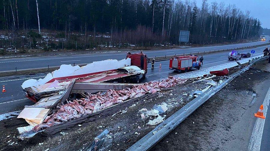 Авария произошла 17 марта около 18.30. "48-летний житель Заславля, управляя тягачом с полуприцепом, на дорожной развязке при спуске с автодороги Бобруйск - Мозырь - граница Украины (Р31) на автодорогу Минск - Гомель (М-5), проезжал закругление дороги. На участке, обозначенном дорожными знаками "Направление поворота", не учел особенности транспортного средства и инертность перевозимого груза - висящие на крюках в рефрижераторе говяжьи туши", - рассказали в ГАИ.