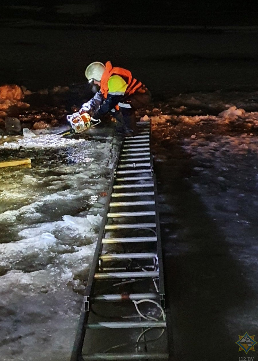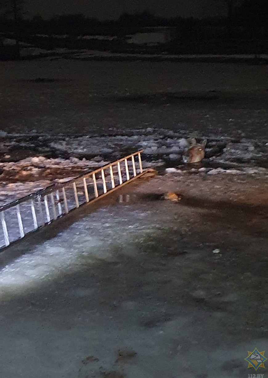 Используя трехколенную лестницу, работники МЧС прорезали лед бензопилой, и в 00.05 попавшие в беду животные были спасены.-0-