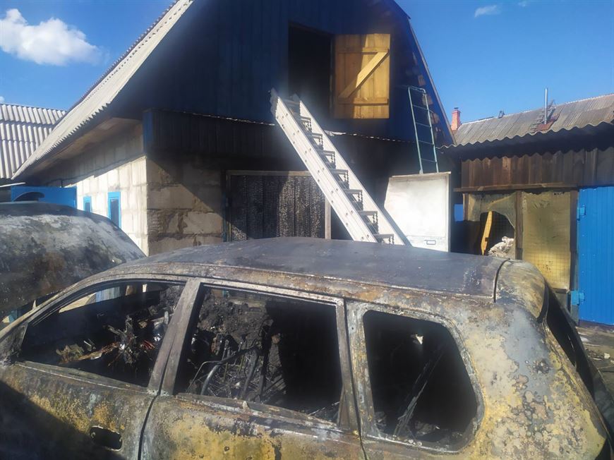 Информация о происшествии поступила в службу спасения днем 21 мая. По прибытии к месту вызова по ул. Синякова спасателями было установлено, что горят легковой автомобиль, фронтон и ворота гаража, расположенного на территории частного домовладения.