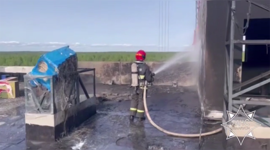 На месте работают четыре автоцистерны и автолестница. Работник МЧС проводят проливку и разборку конструкций.При пожаре никто не пострадал.-0-