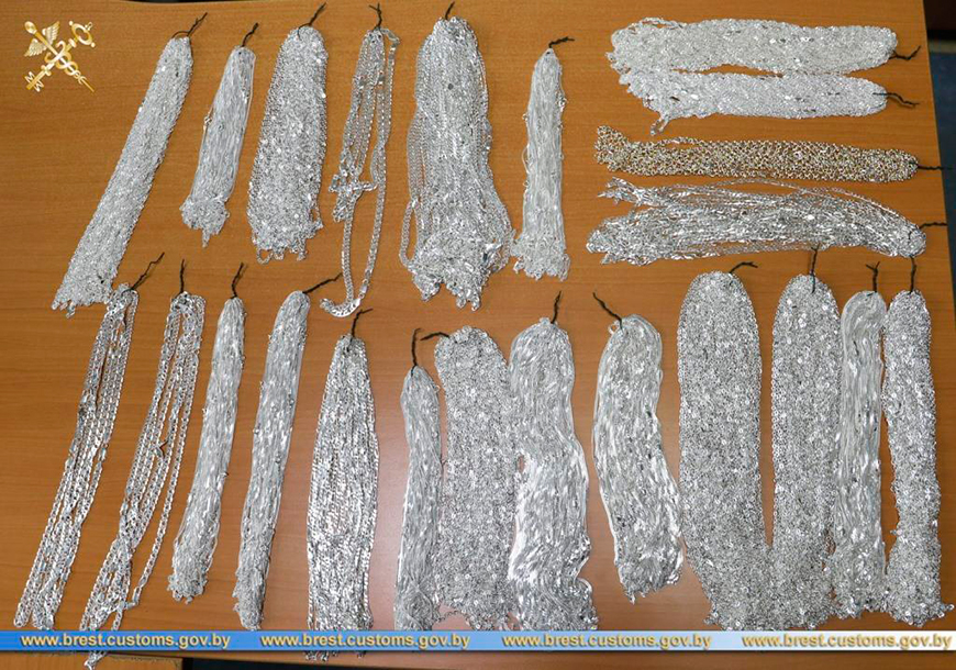 Ювелирные изделия общим весом 3,25 кг перемещал 46-летний житель Каменецкого района, следовавший рейсовым автобусом Седльце - Брест. Для прохождения границы мужчина выбрал зеленый коридор, заявив тем самым, что у него отсутствуют товары, подлежащие декларированию. При досмотре инспекторы обнаружили 509 серебряных цепочек 925 пробы, которые были спрятаны в носки и находились в рюкзаке с личными вещами. При этом только в сентябре гражданин пересекал границу в среднем два раза в неделю.