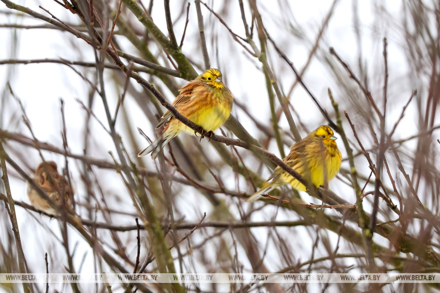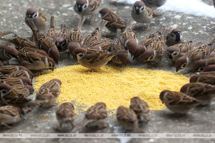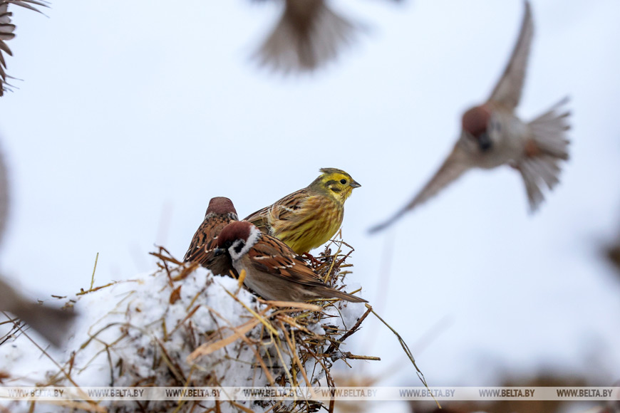 5. 8 января 2026 года. Обыкновенная овсянка и воробьи. Фото Виталия Пивоварчика.