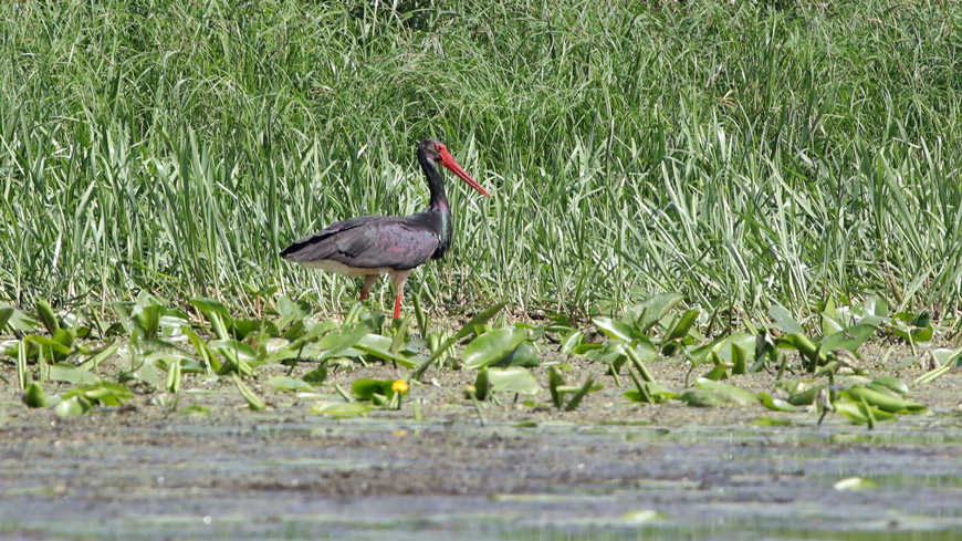 Черный аист разнится со своим белым собратом не только цветом оперения. Еще два надежных отличительных признака - ярко-красное пятно вокруг глаза и… перепонки!- Он практически не ест мышей, а специализируется на рыбе и рептилиях. Соответственно куда больше времени проводит в воде. Именно по этой причине у него остались такие перепонки. Так что вы никогда не увидите черного аиста, который ходит по полю за комбайнами, - ему там нечего ловить, - отмечает Павел Пакуль.
