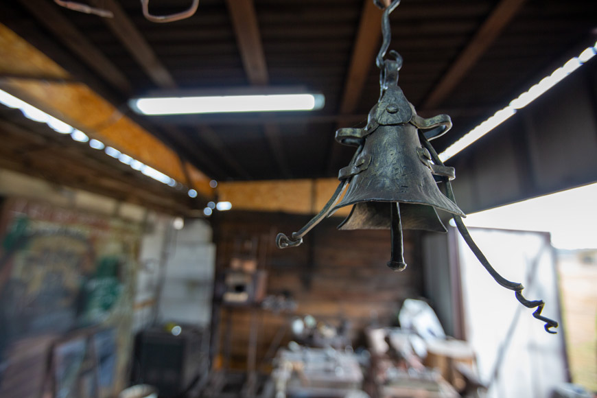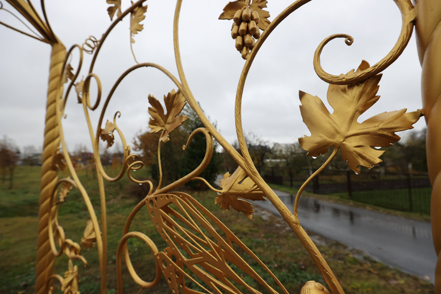 Завершив рабочий процесс, Алексей Зайцев выключил горн, пневмомолот и провел экскурсию по своей кузнице, которая больше напомнила нам мастерскую художника. Первым делом привлекла внимание искусно выкованная решетка для балкона. Рядом с ней будто росло из земли пока не завершенное стальное дерево. Еще больше поразила скульптура монаха, душа которого вот-вот должна переродиться и стать светлой. Пока же одна его нога представлялась волчьей лапой.