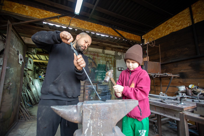 Алексей Зайцев с девятилетним сыном Архипом встречает нас на пороге кузни в деревне Вяжути. Наш герой с улыбкой вспоминает, как в 2019 году вместе с семьей подыскивали себе домик на селе, куда можно было бы приезжать из Минска на выходные.