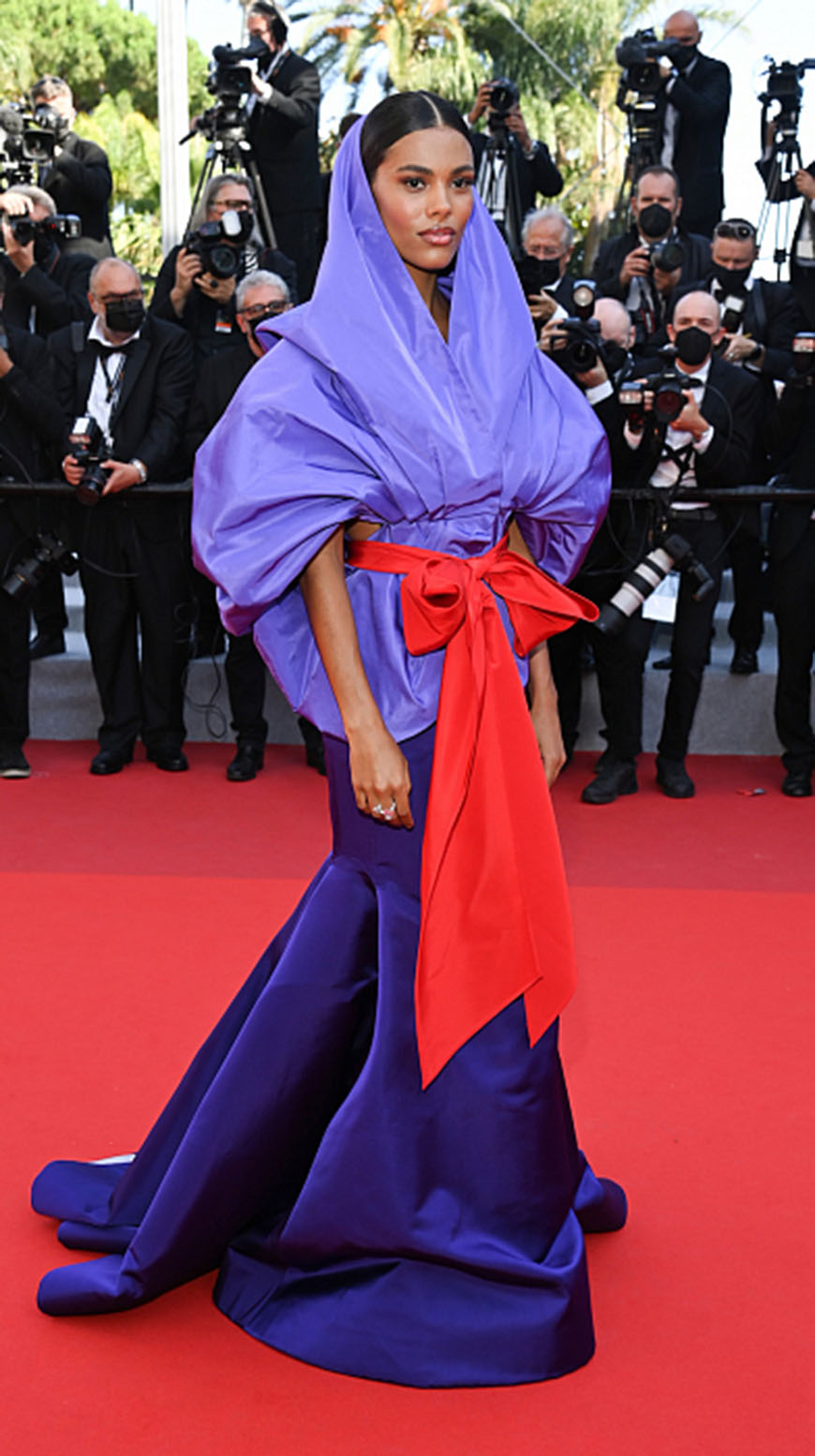 Достоин внимания и экстравагантный образ модели Тины Кунаки. Для выхода в свет девушка выбрала сиреневое платье Valentino с капюшоном и красным бантом на талии и не прогадала - на какой-то момент все внимание репортеров было приковано только к ней.
