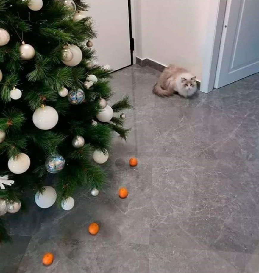 Удивительно, но после этого питомец ни разу не приближался к елке, а мандарины исправно исполняют возложенную на них функцию.
