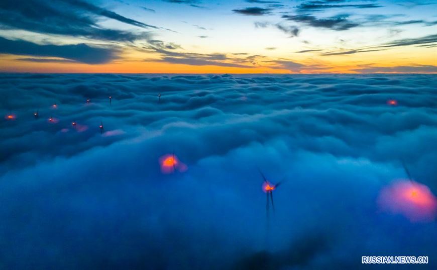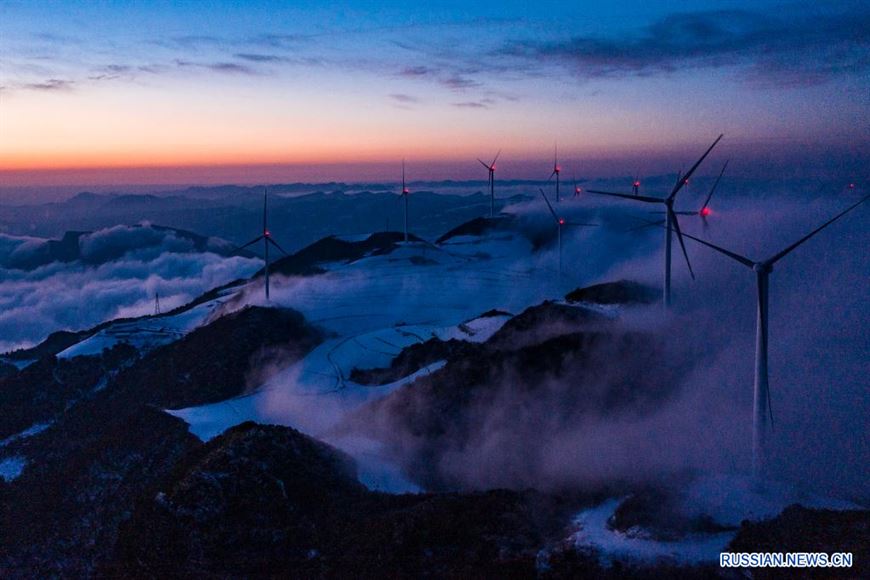 27 февраля, Ичан /БЕЛТА - СИНЬХУА/. Окутанные облаками вращающиеся ветряные турбины на заснеженной территории ветряной электростанции в уезде Цзыгуй китайской провинции Хубэй, создают живописный пейзаж.-0-
