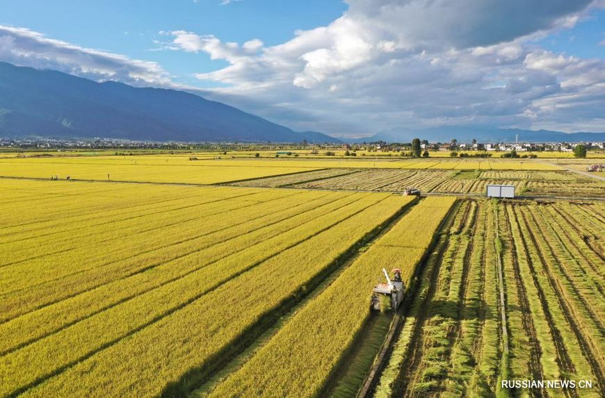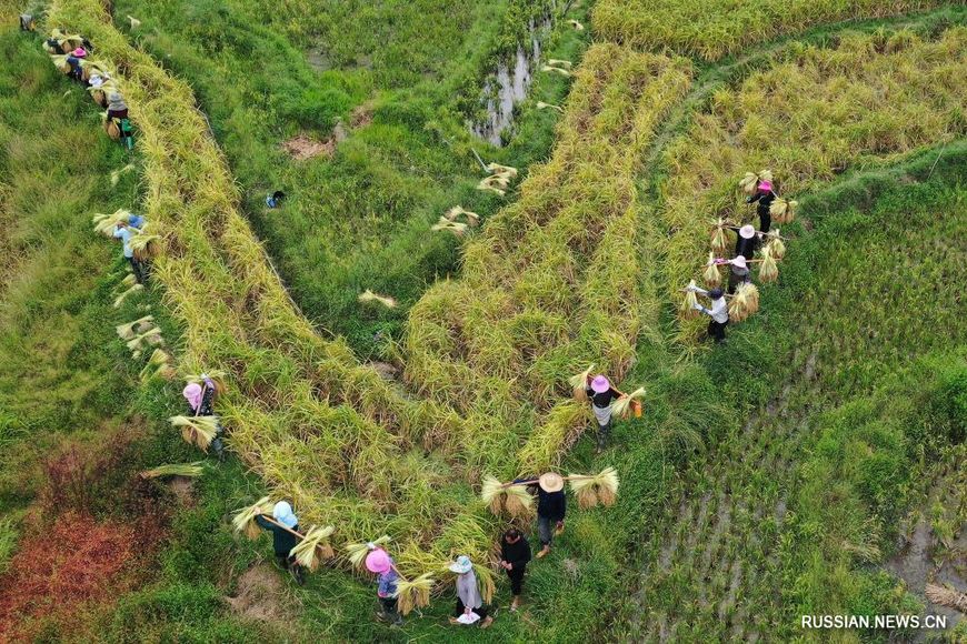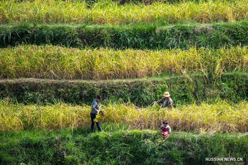 12 октября, Пекин /БЕЛТА - СИНЬХУА/. Осенью во многих районах Китая собирают урожай поливного риса. Поля в это время приобретают золотые краски, что создает прекрасные пейзажи.-0-