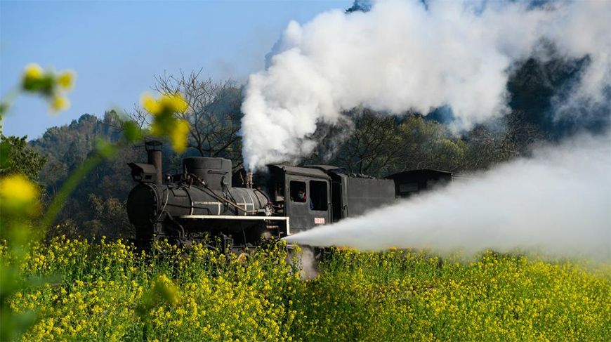 3 марта, Сычуань /БЕЛТА - СИНЬХУА/. Паровоз проезжает мимо цветущих полей в городском округе Лэшань в провинции Сычуань на юго-западе Китая.-0-