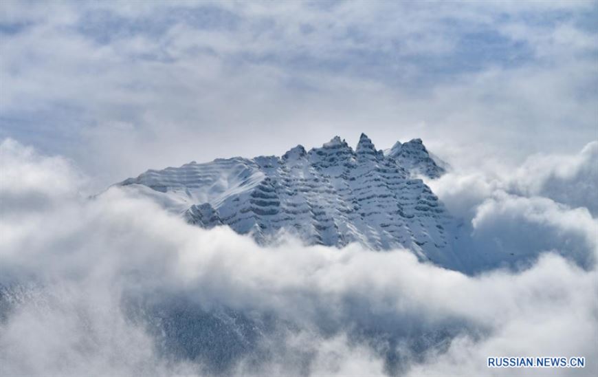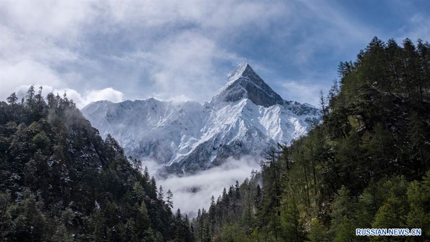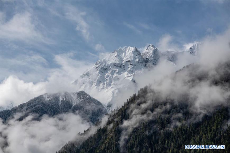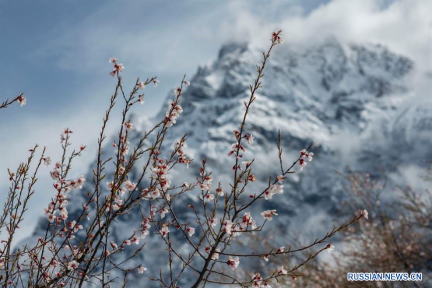 19 апреля, Линчжи /БЕЛТА - СИНЬХУА/. Цветение персиков на фоне заснеженных горных вершин в уезде Боми города Линчжи Тибетского автономного района похоже на живописную картину.-0-