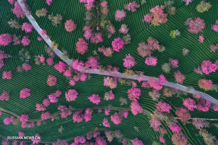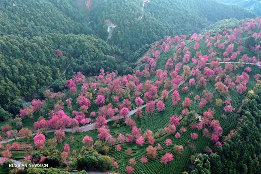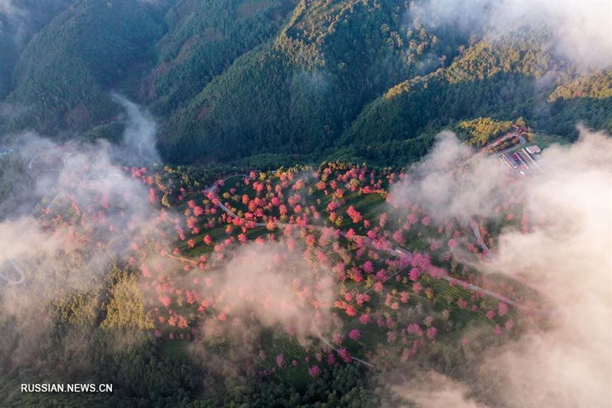 20 декабря, Юньнань /БЕЛТА - СИНЬХУА/. В горах Уляншань в провинции Юньнань на юго-западе Китая пышно цветут вишневые деревья.-0-