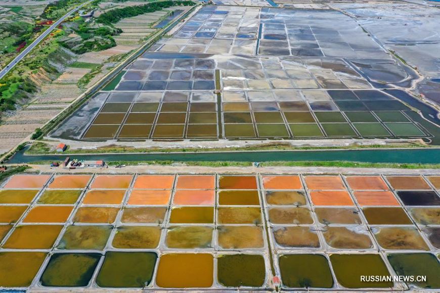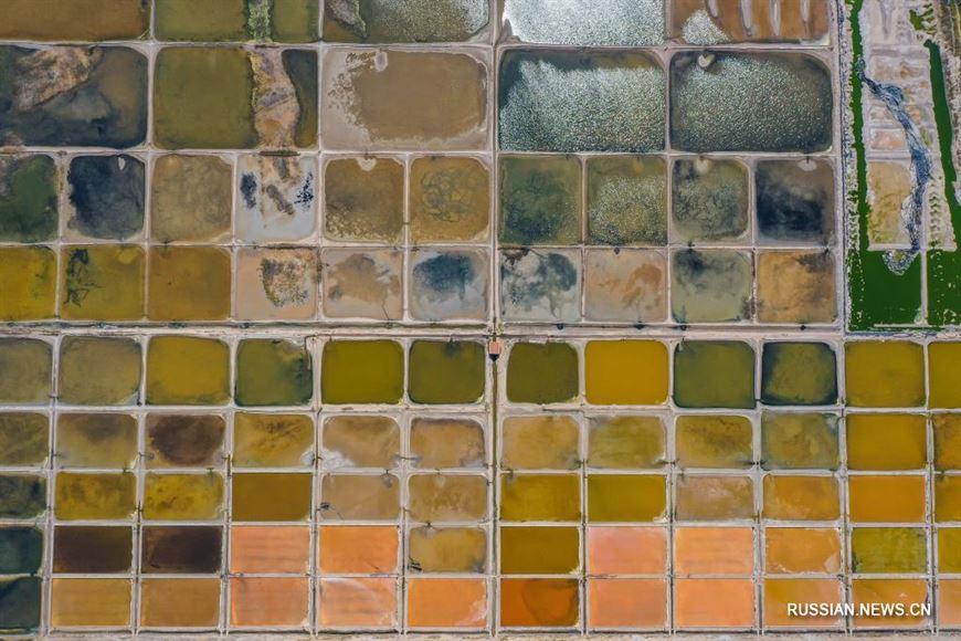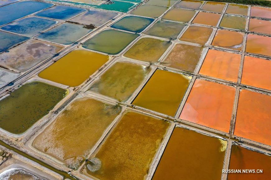 12 мая, Шаньдун /БЕЛТА - СИНЬХУА/. Солеварни, расположенные на берегу моря в поселке Ганси провинции Шаньдун Восточного Китая, выглядят как разноцветная палитра красок.-0-