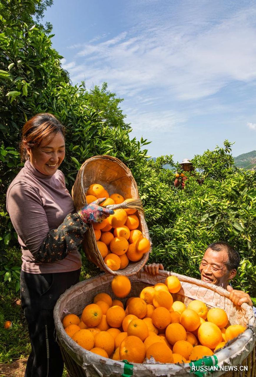 29 апреля, Хубэй /БЕЛТА - СИНЬХУА/. В уезде Цзыгуй провинции Хубэй фермеры собирают урожай апельсинов.-0-