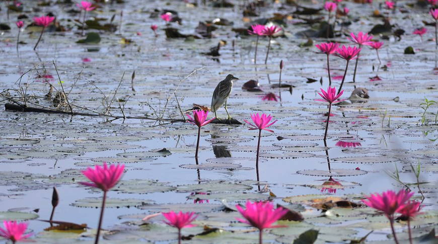 8 ноября, Моригаон /БЕЛТА-СИНЬХУА/. В индийском штате Ассам цветут великолепные розовые кувшинки, украшающие гладь озера. Вокруг них летают стрекозы и ходят цапли.-0-