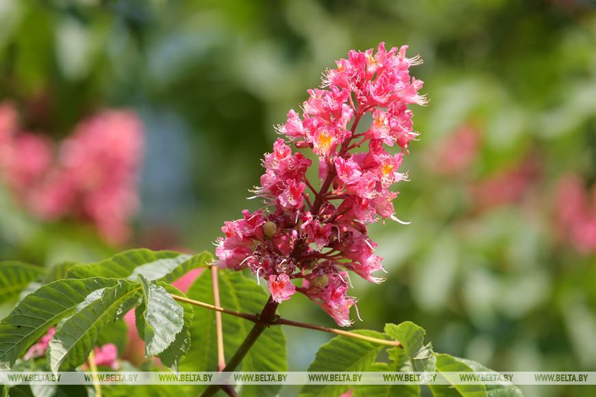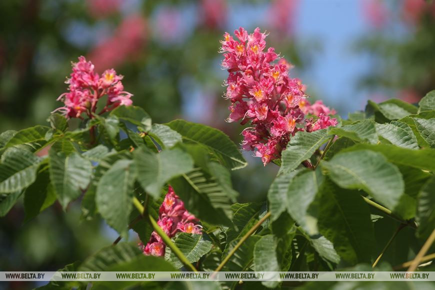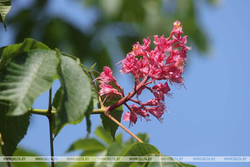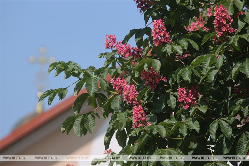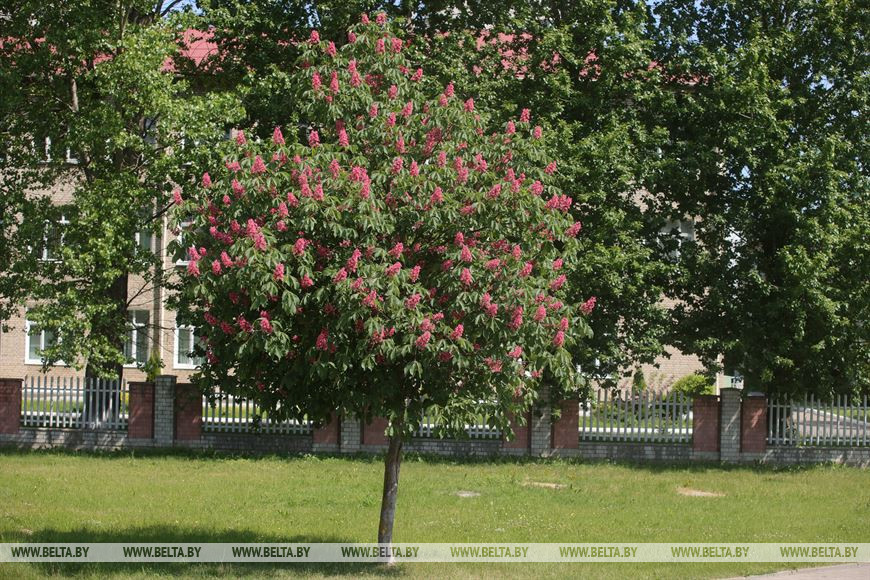 28 мая, Гродно /Корр. БЕЛТА/. Традиционно цветение каштанов приходится на месяц май. Теплая солнечная погода, почти летняя, располагает к цветению ароматной сирени и жасмина, а также каштана - необычного красного оттенка. Городские клумбы пестрят яркими красками и благоухают сладкими цветочными нотками, чем привлекают внимание прохожих. Красный конский каштан - непривычное растение для Беларуси, ведь он является гибридом двух видов растений.-0-